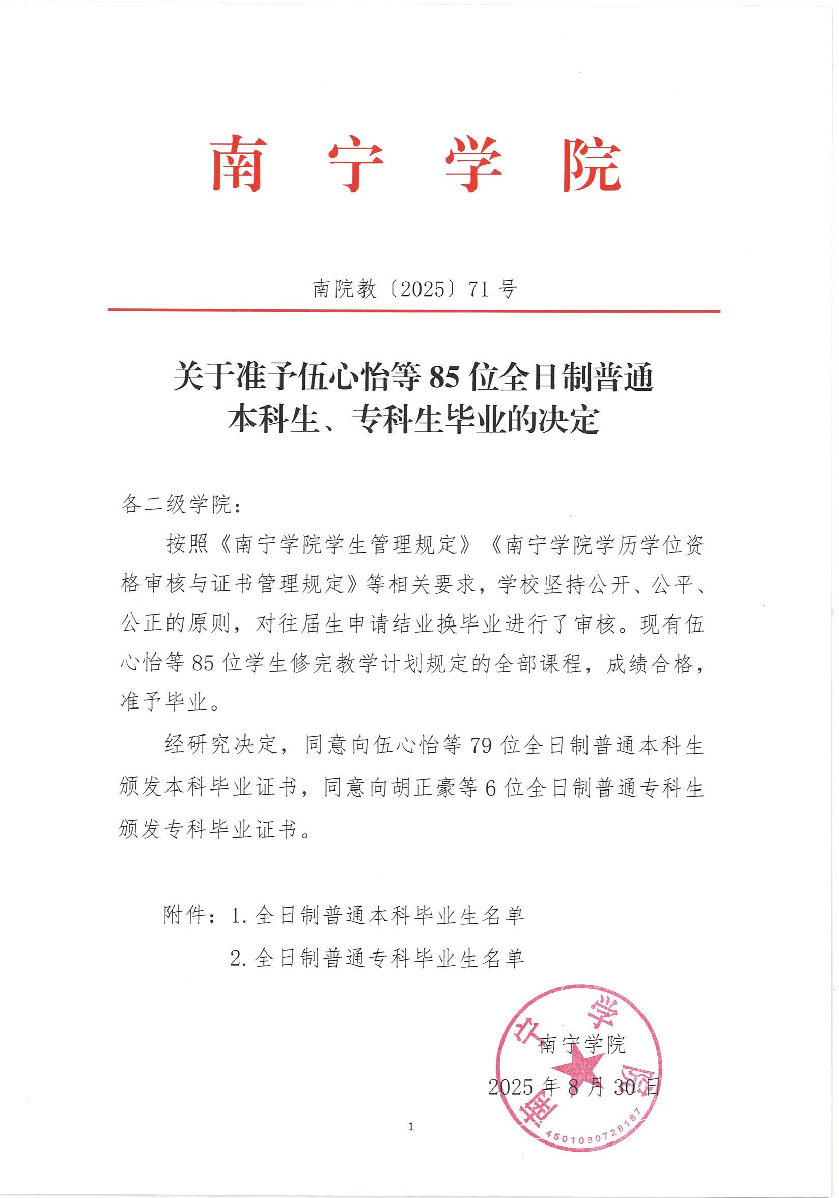 关于准予伍心怡等85位全日制普通本科生、专科生毕业的决定