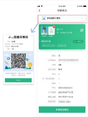 3、 点击“获取图像采集码”按钮,点击下面的“保存图片”按钮,采集当天出示已保存在手机相册的这个“学信网图像采集码”就可以直接拍照。(采集码保存有效、长期有效!)